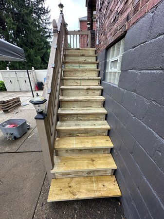 This job involved not just a simple board swap but structural reinforcement to ensure long-term safety and durability. The new treads and supports were custom-fitted and leveled to match existing geometry, and special attention was given to rotted areas at the base of the stairs. Cross-bracing and additional screw anchoring were used to enhance the strength of the bottom section.